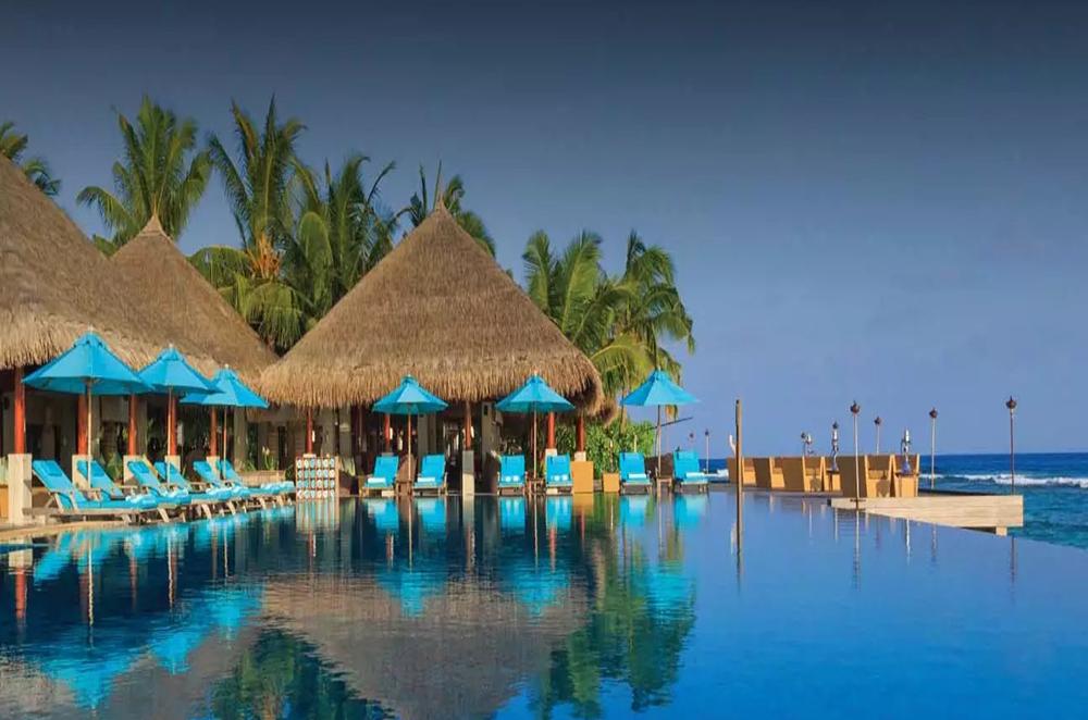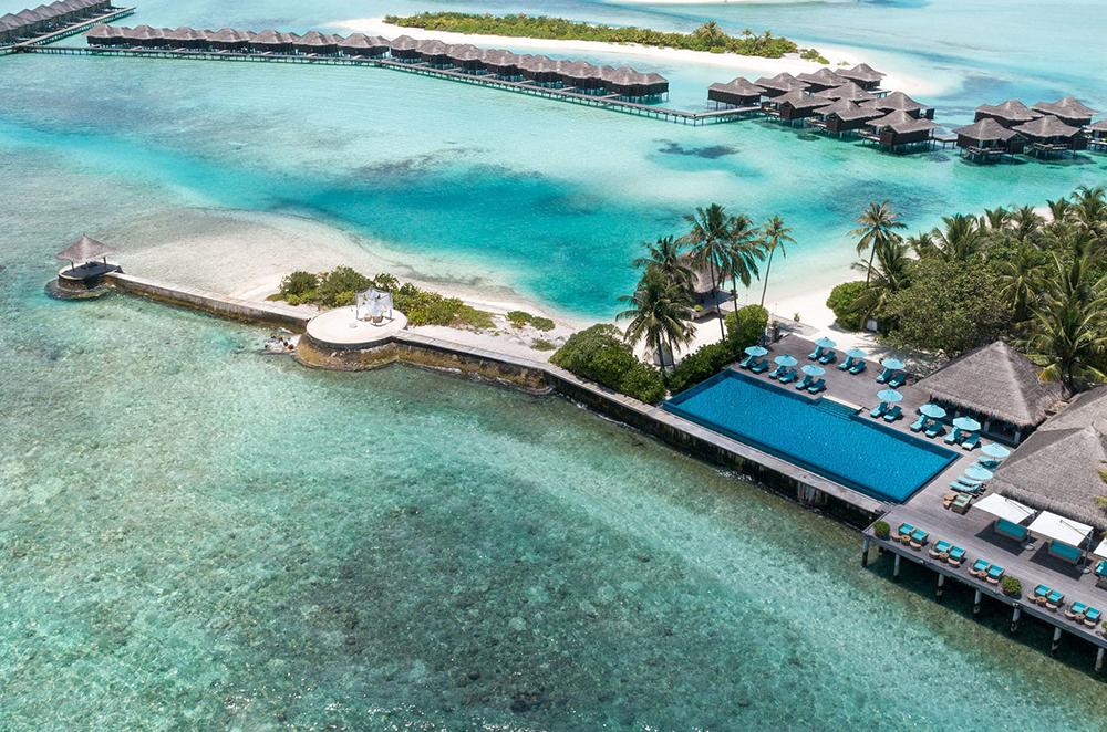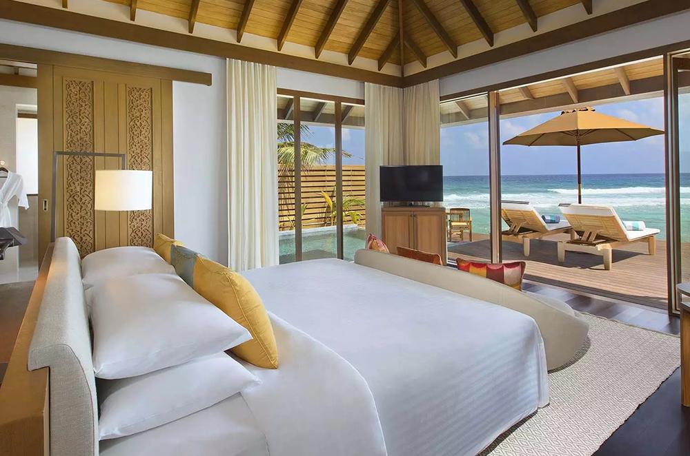 The Deluxe Over Water Bungalow offers expansive living space, with a split-level sundeck out over the lagoon and a dressing area adjacent to the bathroom.Lounge indoors or out on comfortable daybeds. Soak in an oversized terrazzo tub for two, watching the sun’s rays dapple over the lagoon.