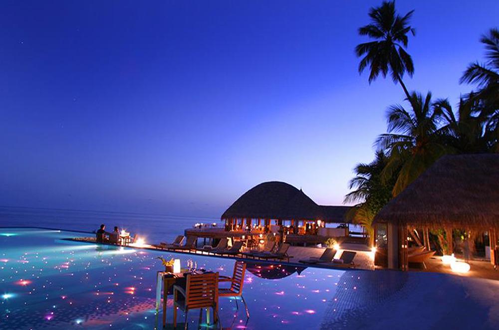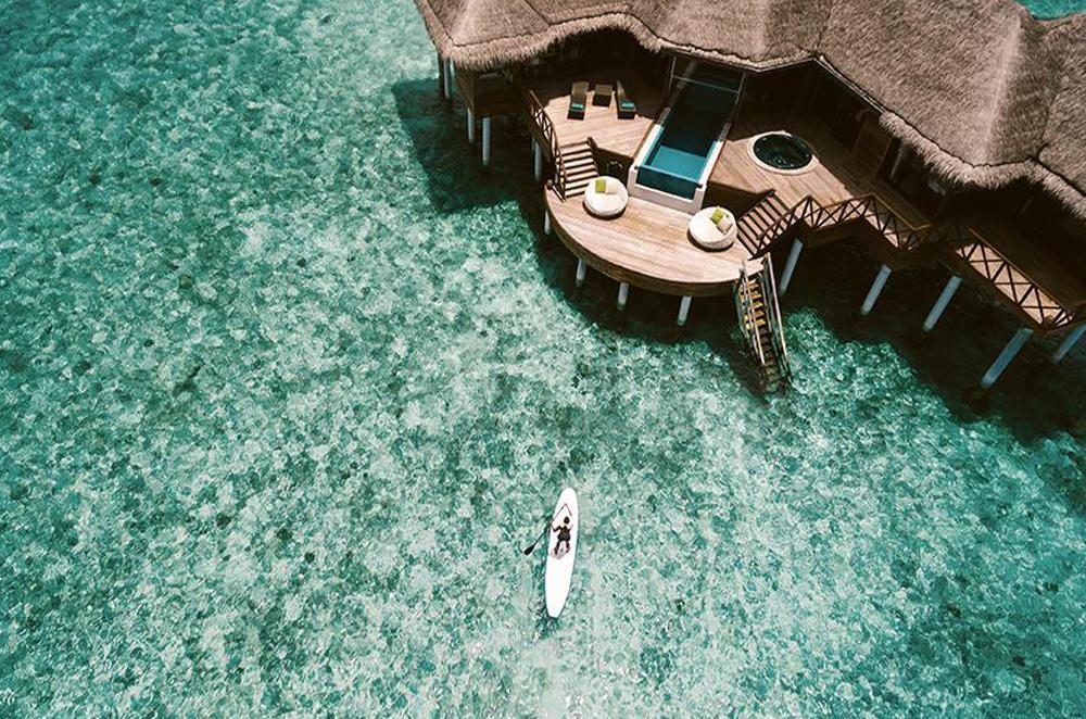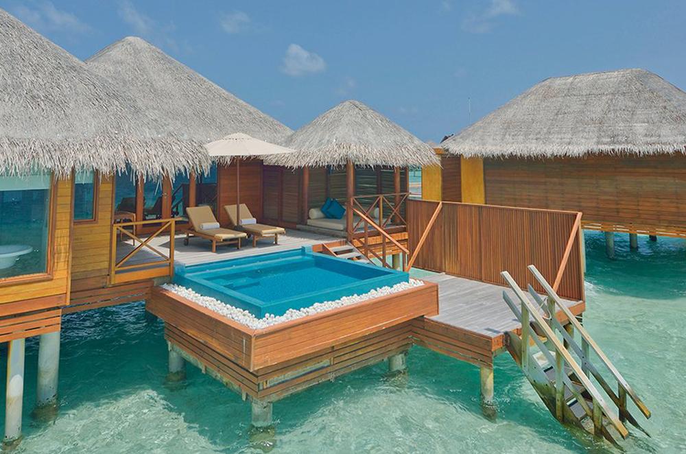 Bold design. Two-bedroom pavilions centre on a freshwater swimming pool. Its infinity edge mimics the horizon. Yawns along with the vast Indian Ocean. The pool spans indoor and outdoor spaces, stretching from the private deck to the living room. Both shaded and exposed. An outdoor Jacuzzi illuminated with fibre-optic lights also perches on the deck.
